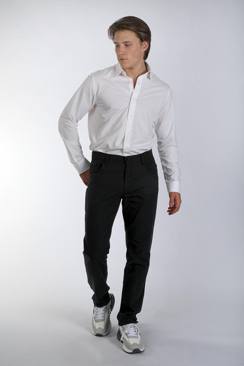 Yüksek bel tasarımı, rahat bir kullanım sunarken, düz kesim ve düz paça detayları modern bir görünüm sağlar.