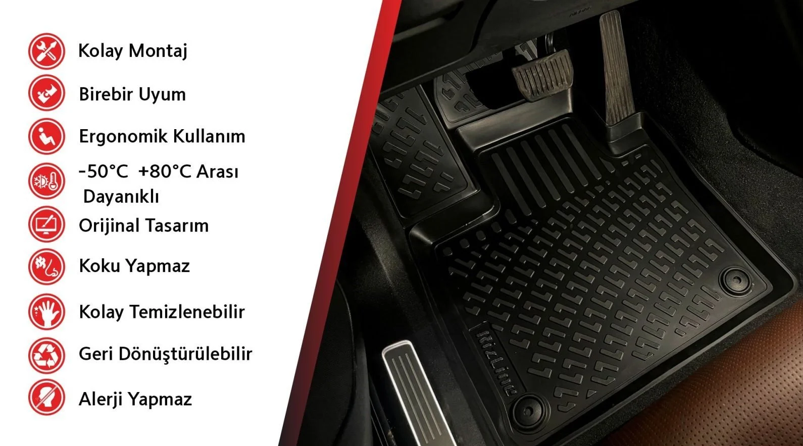 n • Uluslararası kalite standartlarına uygun olarak, yüksek teknoloji ile hijyenik termokauçuk kullanılarak imal edilmiştir. • Sağlık ve Hijyen Sertifikası ile Uygunluk Sertifikasına sahiptir. • Alerjiye neden olmaz. • Koku yapmaz. • Deforme olmaz • Ekolojik, doğayla dost, geri dönüştürülebilen malzemeden imal edilmiştir. • 50°C den +80°C ye kadar yüksek dayanıklılığa sahip, kendini salmayan kaliteli malzemeden imal edilmiştir. • Şeklini kaybetmez. • Derinlik: 3 – 5 Cm. (araç modellerine göre farklılık gösterir) • Kalınlık: 1,1-1,7 mm arası • Sağlam gövde yapısı sayesinde güneş ışığına, aşınmalara, sıcaklığa, soğukluğa ve suya dayanıklıdır. • Bagaj Havuzu yan yüzeylerinde bulunan yaklaşık 3 – 5 cm kalınlığından bariyer çıkıntısı sayesinde, bagaj havuzu dışına çıkabilecek su, toz, çamur vb. maddelerin aracınızı kirletmesini engeller. • Aracınızın bagaj kısmının temiz ve düzenli durmasını sağlar. • Soğukta ve sıcakta sertleşme ve kırılma yapmaz. • Kaymaz malzemesi sayesinde bagajınıza koyduğunuz eşyaların gezmesini engeller • Pratik ve kolay şekilde yıkanır ve çabuk kurur. • Şık tasarımı ile aracınızın bagajına estetik katar. • Pratik ve kolay şekilde yıkanır, çabuk kurur • Profesyonellik gerektirmeyen, kişisel uygulamalı bir ürünüdür • Araç modeliyle tamamen uyumlu orijinal üründür. n