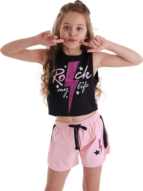 2 parça takım. Crop-top, kısa kesim, üzeri baskılı, pamuklu kumaştan t-shirt ve pamuklu kumaştan özel kesim, mini şort.