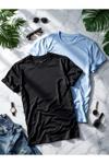 Erkek Siyah-Mavi %100 Pamuk Slim Fit T-Shirt 2 Li Paket
