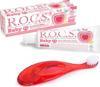 ROCS Baby 0-3 Yaş Elma Püresi Tadında Diş Macunu kırmızı renkli bebek diş fırçası ile avantajlı fiyata set olarak sunuluyor. Bebeğiniz ilk dişinin çıkmasıyla birlikte ilk diş macununa ve ilk diş fırçasına sahip olmalıdır. R.O.C.S. Baby diş macunu bebek dişlerini, diş minesine zarar vermeden nazikçe temizlemeye yardımcı olur. Diş minesinin doğal mineralizasyonunu destekleyerek güçlenmesini sağlamayı hedefler. Huş ağacından elde edilen doğal ksilitol içeriği çürüklere karşı güvenli koruma sağlar. florür, sodyum lauril sülfat, yapay tatlandırıcı ve renklendirici içermez. Bebeklerin çok sevdiği elma püresi tadı tamamen doğal bileşenlere dayanır.