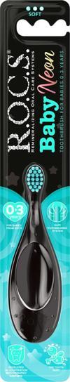 R.O.C.S. Bebek Diş Fırçaları şimdi Neon serisi ilebebeğinizin ilgisini çekecek yepyeni canlı renklerde. 3 yaş ve daha küçükçocukların dişleri, ilk dişten itibaren ebeveynler tarafından fırçalanmalıdır.Diş fırçasının tasarımı narin bebek dişlerinin etkili ve güvenli fırçalanmasıiçin geliştirilmiştir. Ultra yumuşak ve özel yuvarlatılmış fırça kıllarıile bebek diş ve diş etini nazikçe temizler. Pamuksu yumuşaklığa sahip fırçakılları narin diş etleri ve kırılgan bebek diş minesi için oldukça güvenlidir.UYARI: DİŞ FIRÇASI OYUNCAK DEĞİLDİR. ÇOCUĞUNUZU DİŞ FIRÇASI İLE YALNIZ BIRAKMAYINIZ. BEBEKLER DİŞ FIRÇASI KILLARINI DİŞLERİ İLE ÇEKİP KOPARTABİLDİĞİNDEN MUTLAKA YETİŞKİN GÖZETİMİNDE KULLANILMASI GEREKMEKTEDİR.