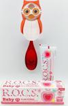 .O.C.S. Baby Elma Püresi tadında diş macunu, diş fırçası ve baykuş figürlü kum saatli saklama kabından oluşan set avantajlı fiyata sunuluyor. R.O.C.S. Baby diş macunu: 0-3 yaş arası bebek dişlerini, diş minesine zarar vermeden nazikçe temizlemeye yardımcı olur. Diş minesinin doğal mineralizasyonunu destekleyerek güçlenmesini sağlamayı hedefler. Huş ağacından elde edilen doğal ksilitol içeriği çürüklere karşı güvenli koruma sağlar. Florür, sodyum lauril sülfat, yapay tatlandırıcı ve renklendirici içermez. Bebeklerin çok sevdiği elma püresi tadı tamamen doğal bileşenlere dayanır. ROCS Baby Dİş Fırçası: Ultra yumuşak ve özel yuvarlatılmış fırça kılları ile bebek diş ve diş etini nazikçe temizler. Pamuksu yumuşaklığa sahip fırça kılları narin diş etleri ve kırılgan bebek diş minesi için oldukça güvenlidir. Geniş fırça sapı, diş fırçasının bebeğin ağız boşluğuna gereğinden fazla girmesini özellikle engellemeye yardımcı olur. UYARI: DİŞ FIRÇASI OYUNCAK DEĞİLDİR. ÇOCUĞUNUZU DİŞ FIRÇASI İLE YALNIZ BIRAKMAYINIZ. BEBEKLER DİŞ FIRÇASI KILLARINI DİŞLERİ İLE ÇEKİP KOPARTABİLDİĞİNDEN MUTLAKA YETİŞKİN GÖZETİMİNDE KULLANILMASI GEREKMEKTEDİR. Flipper Saklama Kabı: Dünyanın en sevimli diş fırçası hijyen bekçileri banyonuzda! Flipper'ın sihirli mekanizması çocukların diş fırçalarını güvenle saklamasına yardımcı oluyor. Tek bir fırça hareketi ile otomatik açılıp kapanan kapaklar, diş fırçalamaya eğlence katıyor. Flipper aynaya veya fayansa güçlü vakumları ile yapışır. Gagasını çevirdiğinizde 1 dakika süreli kum saatine dönüşür, çocukların doğru sürede diş fırçalamalarına yardımcı olur.