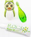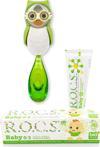 R.O.C.S. Baby Papatya tadında diş macunu, diş fırçası ve baykuş figürlü kum saatli saklama kabından oluşan set avantajlı fiyata sunuluyor. R.O.C.S. Baby diş macunu: 0-3 yaş arası bebek dişlerini, diş minesine zarar vermeden nazikçe temizlemeye yardımcı olur. Diş minesinin doğal mineralizasyonunu destekleyerek güçlenmesini sağlamayı hedefler. Huş ağacından elde edilen doğal ksilitol içeriği çürüklere karşı güvenli koruma sağlar. Florür, sodyum lauril sülfat, yapay tatlandırıcı ve renklendirici içermez. Bebeklerin çok sevdiği papatya tadı tamamen doğal bileşenlere dayanır. ROCS Baby Dİş Fırçası: Ultra yumuşak ve özel yuvarlatılmış fırça kılları ile bebek diş ve diş etini nazikçe temizler. Pamuksu yumuşaklığa sahip fırça kılları narin diş etleri ve kırılgan bebek diş minesi için oldukça güvenlidir. Geniş fırça sapı, diş fırçasının bebeğin ağız boşluğuna gereğinden fazla girmesini özellikle engellemeye yardımcı olur. UYARI: DİŞ FIRÇASI OYUNCAK DEĞİLDİR. ÇOCUĞUNUZU DİŞ FIRÇASI İLE YALNIZ BIRAKMAYINIZ. BEBEKLER DİŞ FIRÇASI KILLARINI DİŞLERİ İLE ÇEKİP KOPARTABİLDİĞİNDEN MUTLAKA YETİŞKİN GÖZETİMİNDE KULLANILMASI GEREKMEKTEDİR. Saklama Kabı: Dünyanın en sevimli diş fırçası hijyen bekçileri banyonuzda! sihirli mekanizması çocukların diş fırçalarını güvenle saklamasına yardımcı oluyor. Tek bir fırça hareketi ile otomatik açılıp kapanan kapaklar, diş fırçalamaya eğlence katıyor. Aynaya veya fayansa güçlü vakumları ile yapışır. Gagasını çevirdiğinizde 1 dakika süreli kum saatine dönüşür, çocukların doğru sürede diş fırçalamalarına yardımcı olur.