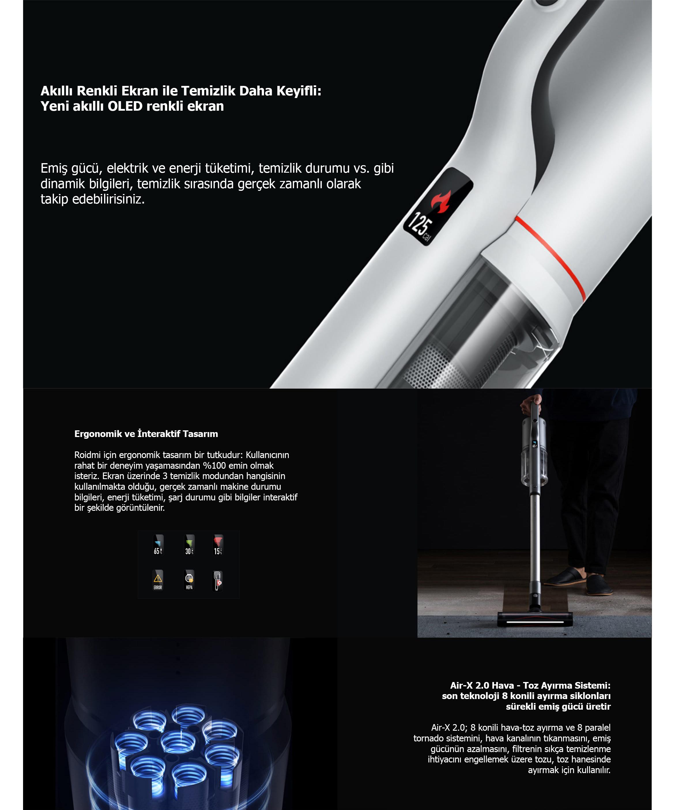 Roidmi X30 Pro kablosuz şarjlı dikey süpürge, renkli OLED ekrana sahip bulunuyor. Emiş gücü, harcanan enerji, temizlik durumu ve elektrik tüketimi gibi bilgiler, çalışma sırasında anlık olarak dikey süpürgenin dijital ekranına yansıyor. Gerçek zamanlı ekran bilgilendirmesi sayesinde kullanıcılar, şarj durumu ve çalışma modu verilerini anlık takip edebiliyor.