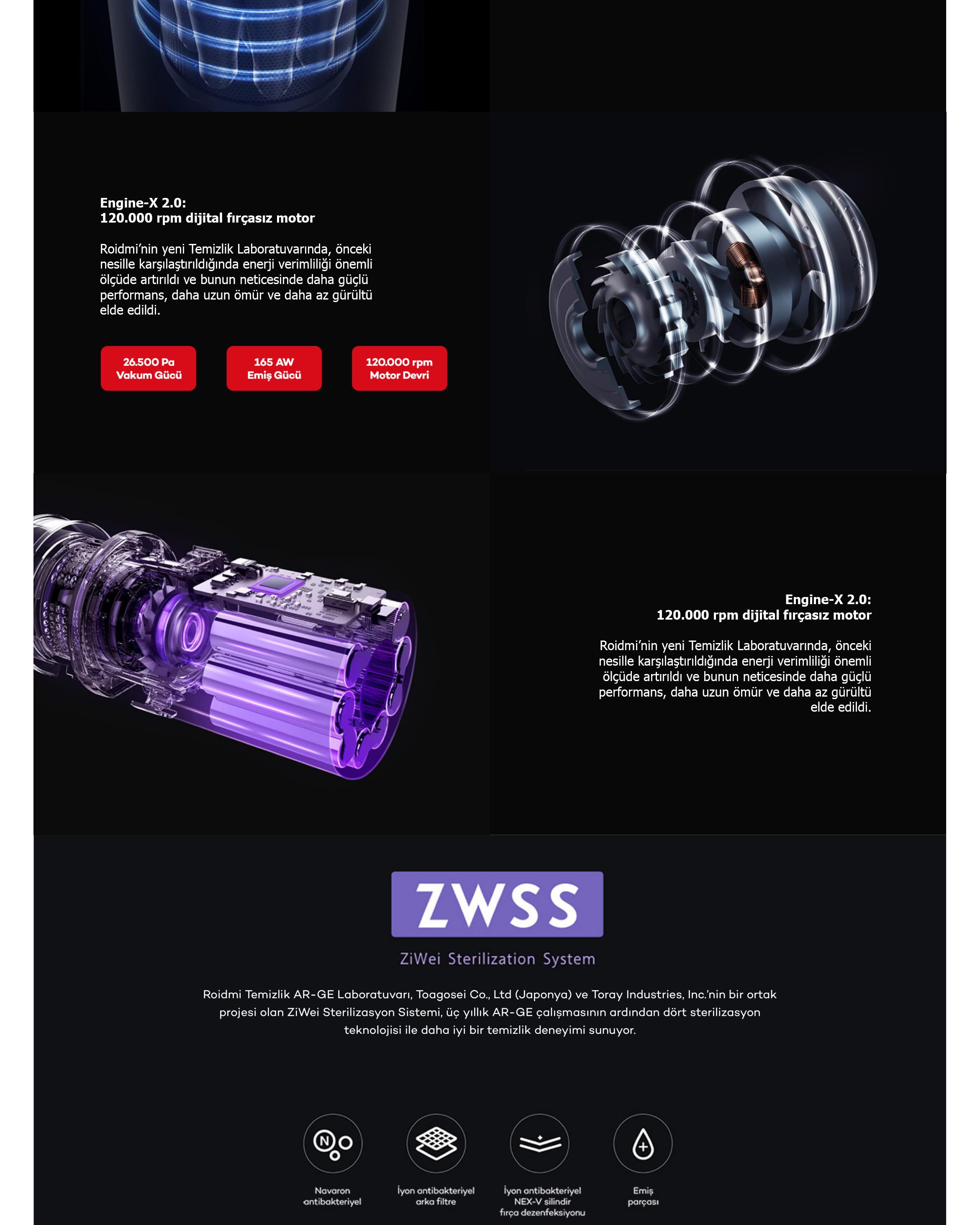 28.8 volt gerilimle çalışan Roidmi X30 Pro kablosuz şarjlı dikey süpürge, 120000 rpm devirli Engine-X 2.0 dijital fırçasız motora sahip. Vakum gücü 26500 Pa, emiş gücü ise 165 AW olan motor, gürültü azaltma filtresi sayesinde çalışmasını üç kat daha az gürültülü gerçekleştiriyor. Dikey süpürgenin ses seviyesi 75 dB olarak ölçülüyor. Güçlü ve sessiz motor, kullanıcılara rahat ve kolay bir temizlik yapma şansı veriyor.