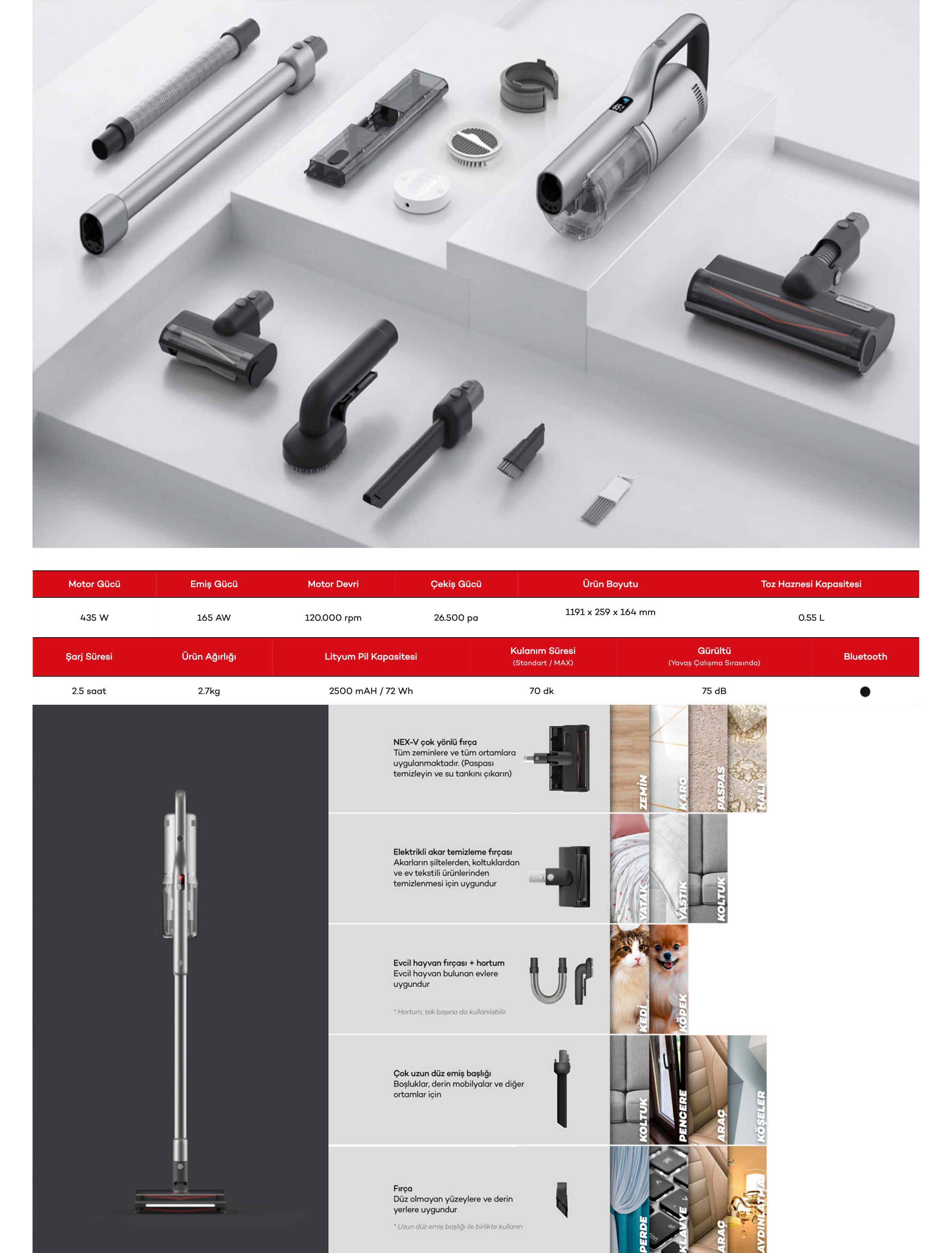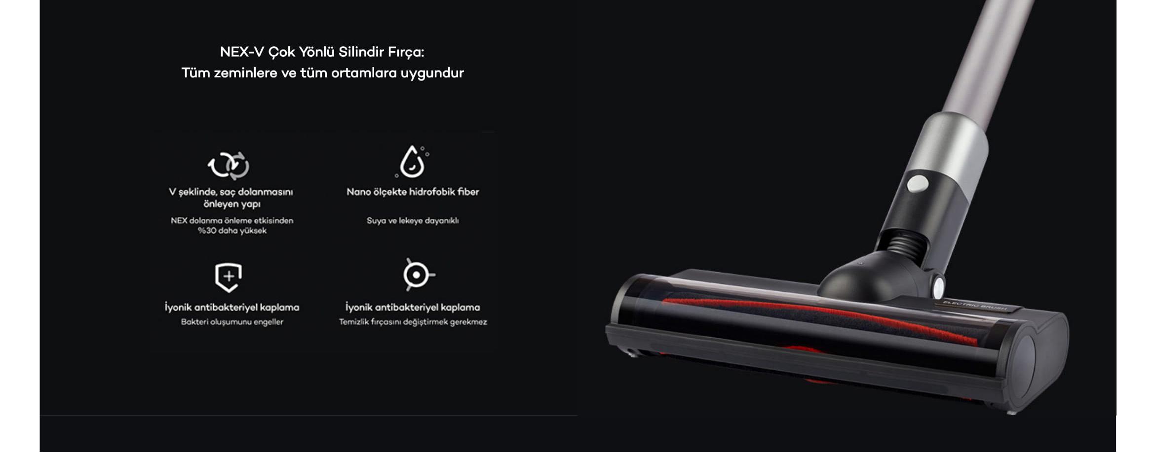 Fonksiyonel fırça NEX-V, tüm zeminlerin temizliği için uygunluk arz ediyor. Nano ölçekli hidrofobik fiber malzemeden imal edilen fırça, suya ve lekelere karşı dayanıklı olması ile dikkat çekiyor. V şeklindeki tasarım, saç dolanma problemi yaşanmamasını sağlıyor. İyonik antibakteriyel kaplama detayı sayesinde bakterilerin büyümesi engelleniyor ve temizlik fırçasının değiştirilmesine gerek kalmıyor. Tabletli kullanım alternatifi sunan su tankı, paspas işlemlerinin yanı sıra zemin dezenfeksiyonu için de kullanılabiliyor.