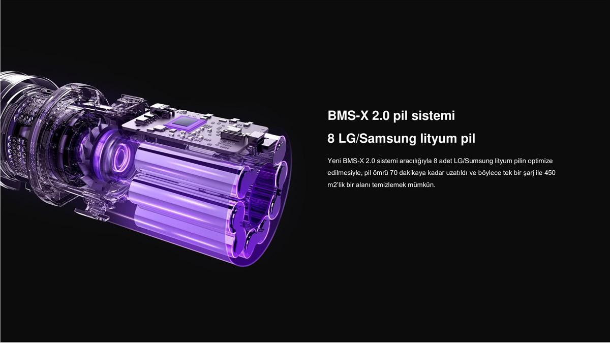 8 adet optimize edilmiş LG / Samsung lityum pilden meydana getirilen BMS-X 2.0 pil sistemi, sadece tek şarjla ortalama 450 metrekare alanın temizlenmesini mümkün hâle getiriyor. Üstün pil sistemi, şarjlı çalışma süresinin 70 dakika daha uzun olmasını sağlıyor. Pratik kullanımlı manyetik şarj aleti, dikey süpürgenin pilinin kablosuz ve hızlı şekilde şarj edilmesine olanak sunuyor. Şarj işlemi için dikey süpürgeyi şarj aletine yaslı tutmak yeterli oluyor.