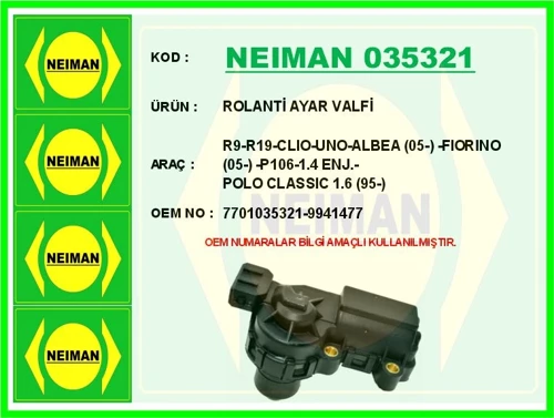 BESCHER NEIMAN 035321 – ROLANTİ AYAR VALFİ R9-R19-CLIO-UNO-ALBEA 05- -FIORINO 05- -P106-1.4 ENJ.-POLO CLASSIC 1.6 95- 7701035321 9941477