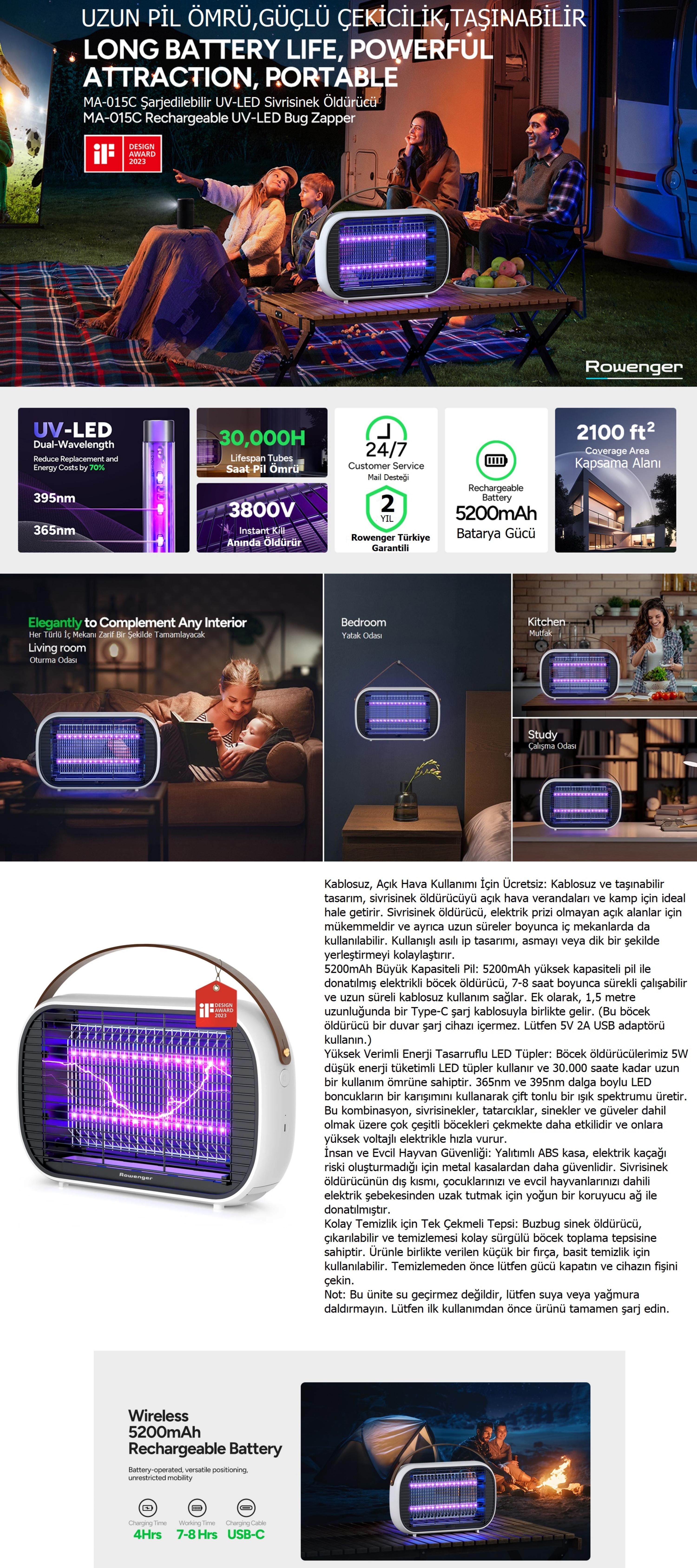 Rowenger MA15C UV-LED Işıklı 5200mAh Şarjlı + Elektrikli Sivrisinek Öldürücü Lamba Sinek Öldürücü Cız