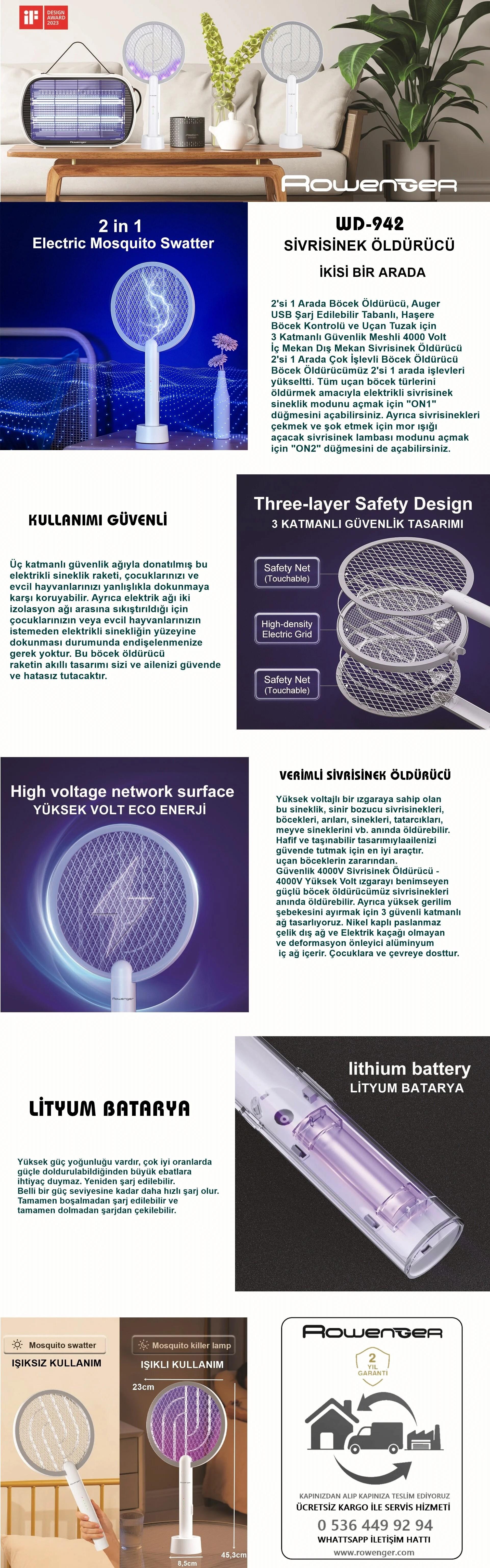 Rowenger WD-942 USB Şarjlı Uv Işıklı Elektrikli Sivrisinek Öldürücü Raket Sinek Öldürücü Şarjlı Raket