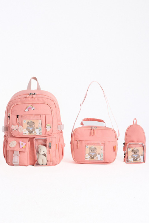 Kore Tarzı Aksesuarlı 3'Lü Set Kız Çocuk Ilkokul Çantası Kalemlikli Beslenme Çantalı Sırt Çantası