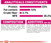 Mısır, kurutulmuş kümes hayvanları proteinleri, pirinç, bitkisel protein izolat*, hayvansal yağlar, mısır gluten, hidrolize hayvansal proteinler, bitkisel lifler, mayalar ve ilgili parçalar, mineraller, pancar küspesi, soya yağı, frukto- oligo-sakkaritler, hodan yağı.