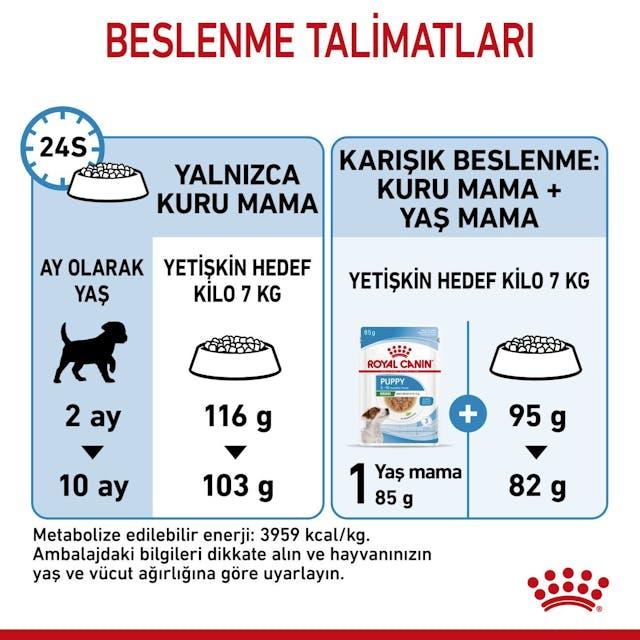 Tam olarak formüle edilmiş bir enerji içeriği ile yaşam tarzını göz önünde bulundurarak evde yaşayan yavru köpeğin büyüme ihtiyaçlarını destekler. KOMPOZİSYON: Kurutulmuş kümes hayvanları proteinleri, pirinç, hayvansal yağlar, mısır, mısır unu, buğday gluten*, pancar küspesi, hidrolize hayvansal proteinler, mineraller, mısır gluten, soya yağı, balık yağı, frukto-oligo-sakkaritler, hidrolize maya (manno-oligo-sakkarit ve beta-glukan kaynağı), alg yağı Schizochytrium sp. (DHA kaynağı), Yucca Schidigera suyu, kadife çiçeği unu (lutein kaynağı). BESLENME TALİMATI: Tabloya bakınız. Parti kodu, tescil numarası ve son kullanma tarihi için, ambalajin üzerine bakınız. Serin ve kuru bir yerde saklayınız. Royal Canin Turkey Evcil Hayvan Ürünleri Ticaret Limited Şirketi tarafından ithal edilmiştir. İLAVELER (her kg için): Beslenmeye dayalı ilaveler: Vitamin A: 25000 IU, Vitamin D3: 1200 IU, Demir (3b103): 40 mg, İyot (3b201, 3b202): 4 mg, Bakır (3b405, 3b406): 12 mg, Manganez (3b502, 3b504): 52 mg, Çinko (3b603, 3b605, 3b606): 134 mg, Selenyum (3b801, 3b811, 3b812): 0,07 mg - Teknolojik ilaveler: Sedimanter kökenli klinoptilolit: 10 g - Koruyucular - Antioksidanlar. *L.I.P.: çok yüksek sindirebilirlik özelliğinden dolayı seçilmiş protein