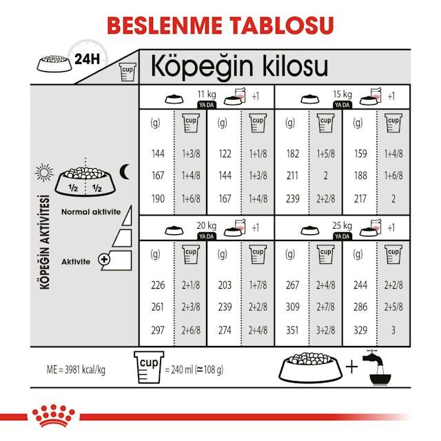 Bir köpeğin deri sağlığı besinsel, mevsimsel ve çevresel faktörlerden etkilenebilir. Aşırı kaşınma, köpeğinizin koruyucu derisine zarar verebilir. KOMPOZİSYON: Pirinç, bitkisel protein izolat*, buğday, hayvansal yağlar, mısır gluten, kabukları çıkartılmış yulaf, mısır, mineraller, hidrolize hayvansal proteinler, soya yağı, pancar küspesi, balık yağı, keten tohumu, frukto-oligo-sakkaritler, hodan yağı, kadife çiçeği özü (lutein kaynağı). BESLENME TALİMATI: Tabloya bakınız. Parti kodu, tescil numarası ve son kullanma tarihi için, ambalajin üzerine bakınız. Serin ve kuru bir yerde saklayınız. Royal Canin Turkey Evcil Hayvan Ürünleri Ticaret Limited Şirketi tarafından ithal edilmiştir. İLAVELER (her kg için): Beslenmeye dayalı ilaveler: Vitamin A: 29500 IU, Vitamin D3: 800 IU, E1 (Demir): 67 mg, E2 (Iyot): 5,5 mg, E4 (Bakır): 13 mg, E5 (Manganez): 67 mg, E6 (Çinko): 150 mg, E8 (Selenyum): 0,17 mg - Koruyucular - Antioksidanlar. *L.I.P.: çok yüksek sindirilebilirlik özelliğinden dolayı seçilmiş protein.