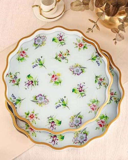 İç yüzeyindeki çiçek desenleri ve altın işlemeler ile çay, kahve ve ikram sunumlarınıza estetik bir dokunuş katar. Farklı boy seçenekleri sayesinde hem servis hem dekoratif amaçlı kullanılabilir.