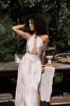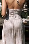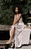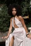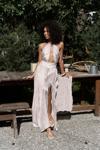 Halter yaka, boyundan bağlamalı uzun elbise. Bağlamalar boncuk aksusear ile detaylandıırlmıştır. Bel kısmı cut-out kesim, çapraz şerit tasarımlı. Yan derin yırtmaç, astarsız.