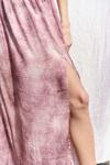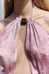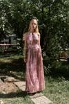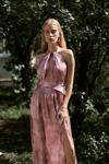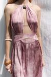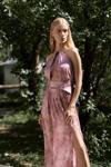 Halter yaka, boyundan bağlamalı uzun elbise. Bağlamalar boncuk aksusear ile detaylandıırlmıştır. Bel kısmı cut-out kesim, çapraz şerit tasarımlı. Yan derin yırtmaç, astarsız.