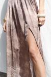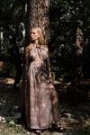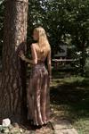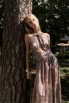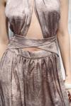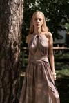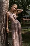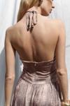 Halter yaka, boyundan bağlamalı uzun elbise. Bağlamalar boncuk aksusear ile detaylandıırlmıştır. Bel kısmı cut-out kesim, çapraz şerit tasarımlı. Yan derin yırtmaç, astarsız.