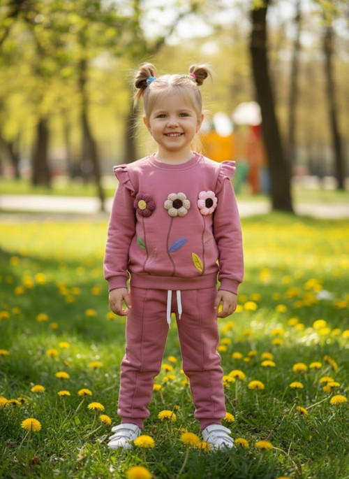Kız Çocuk Nakış Çiçek Detaylı Uzun Kollu Mevsimlik Alt Üst Takım