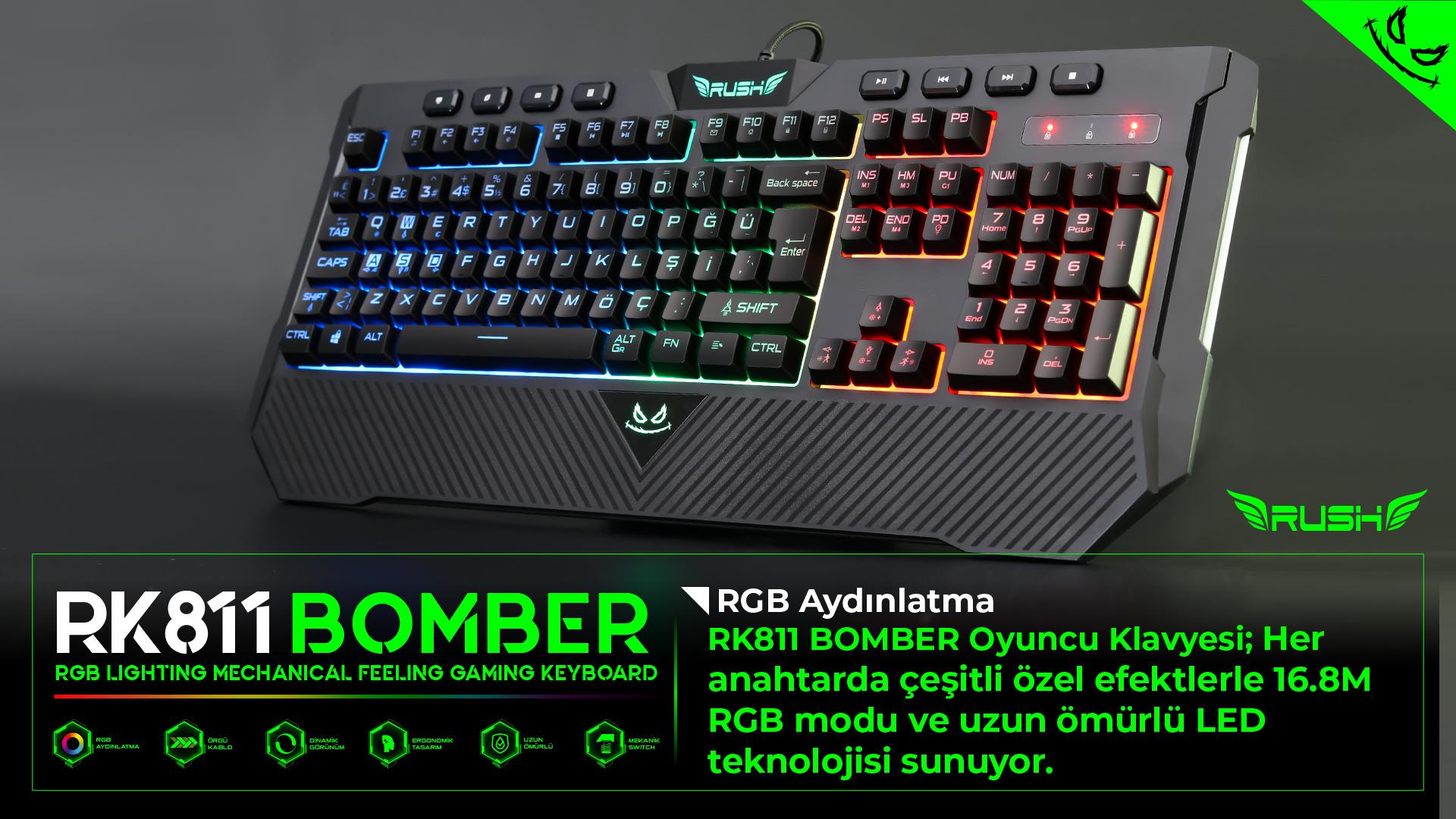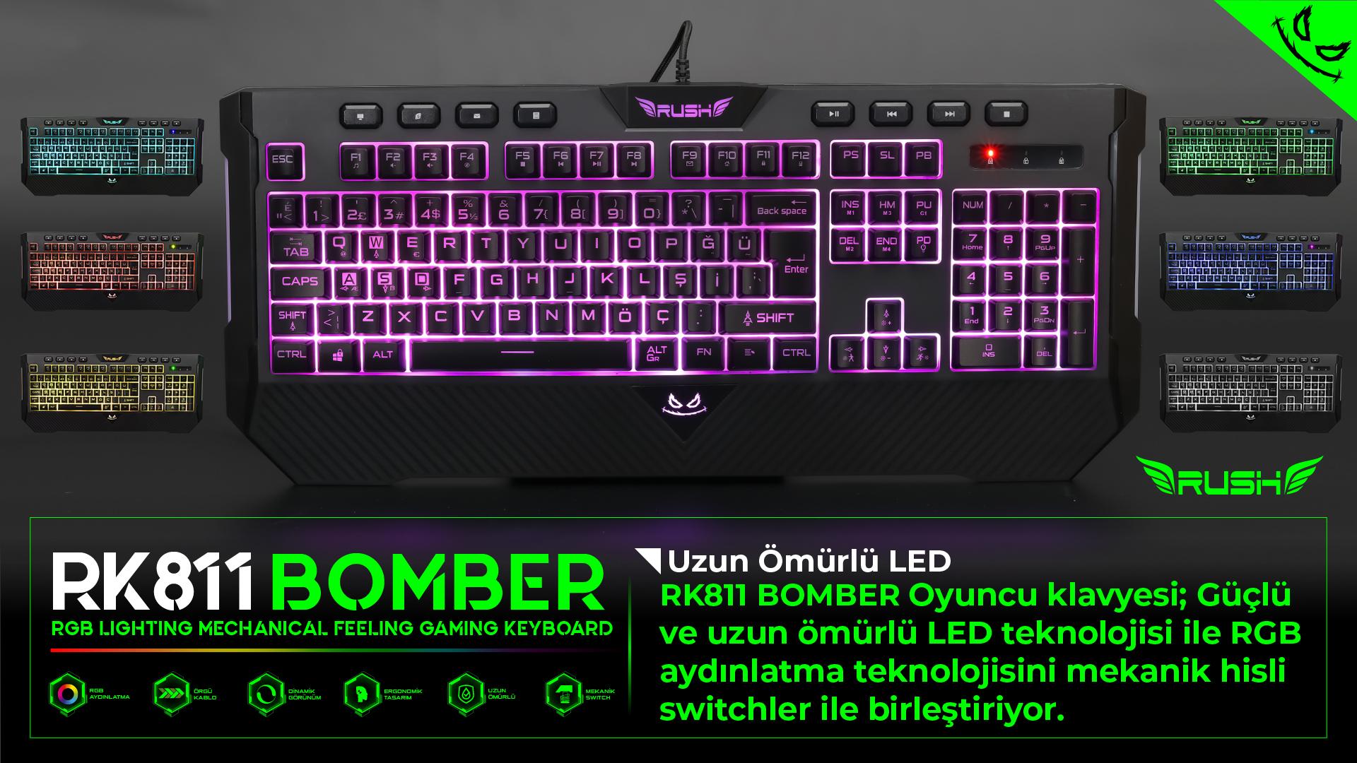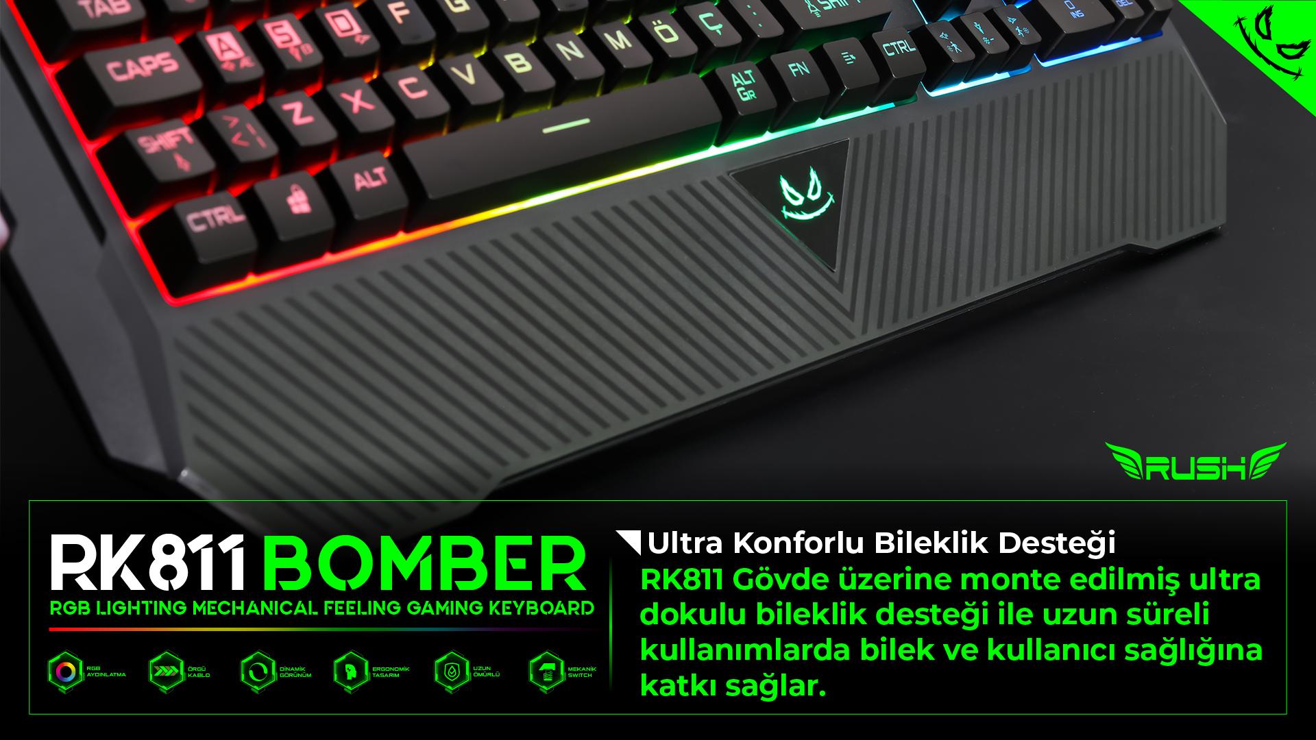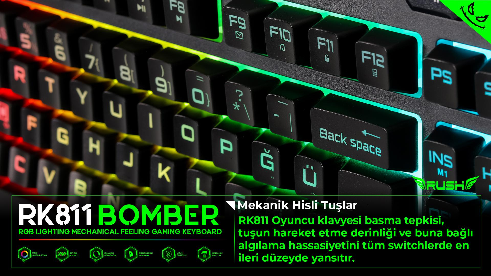 RK811 BOMBER Oyuncu Klavyesi; Güçlü ve uzun ömürlü LED teknolojisi ile RGB aydınlatma teknolojisini mekanik hisli swithcler ile birleştiriyor.