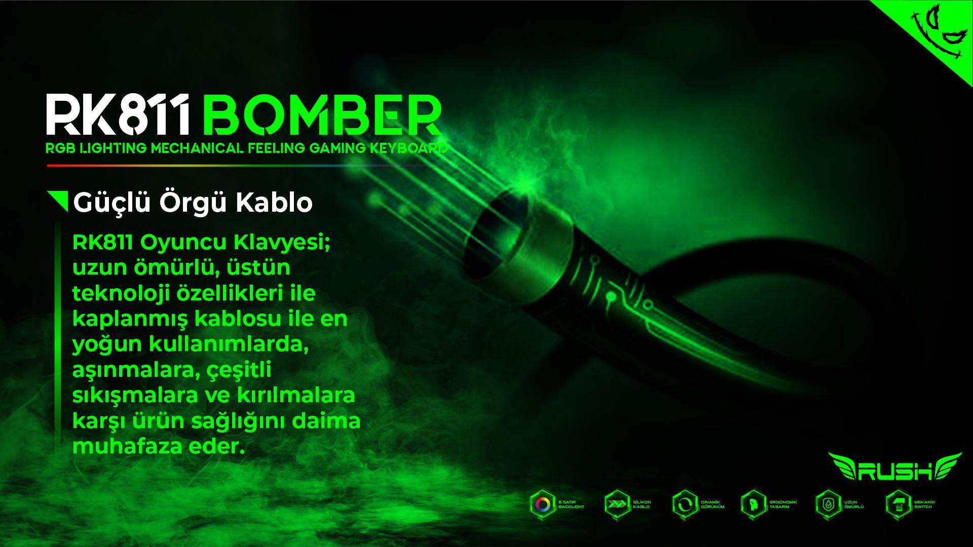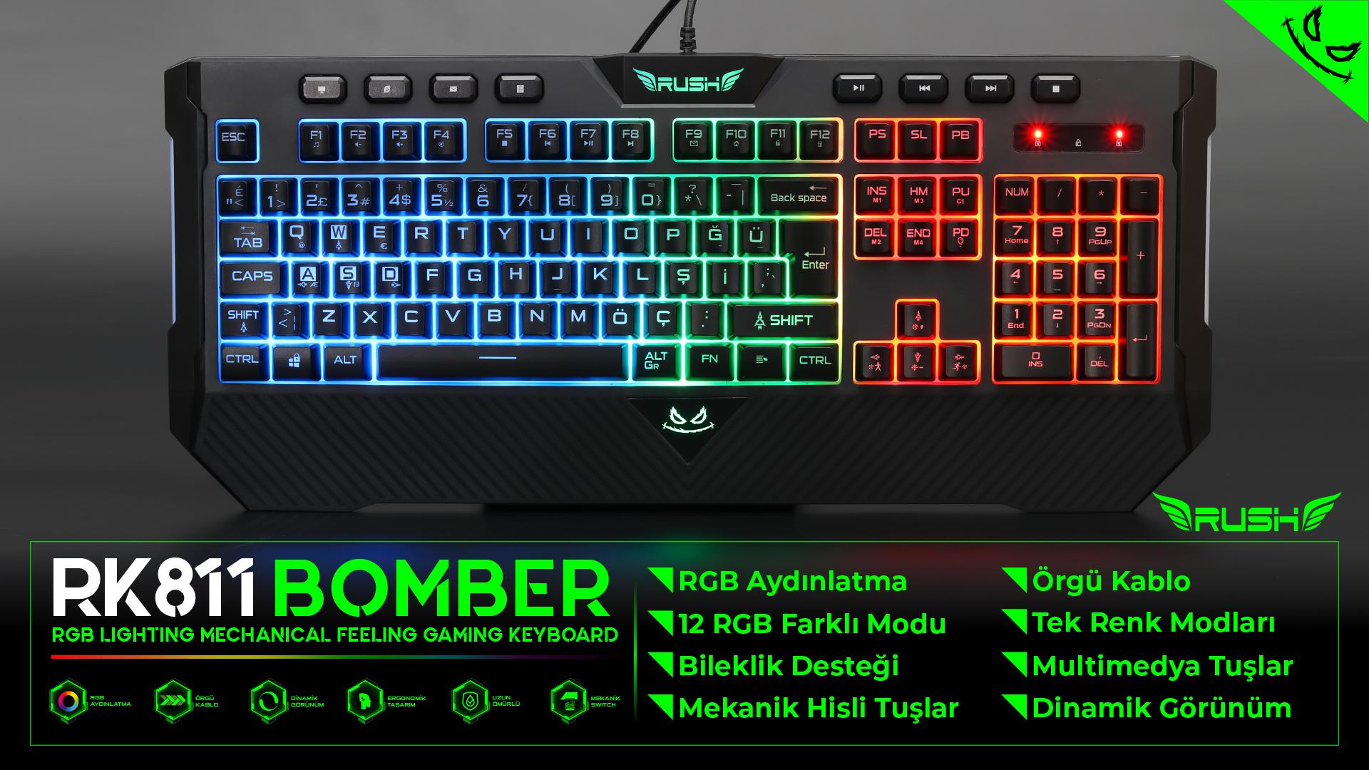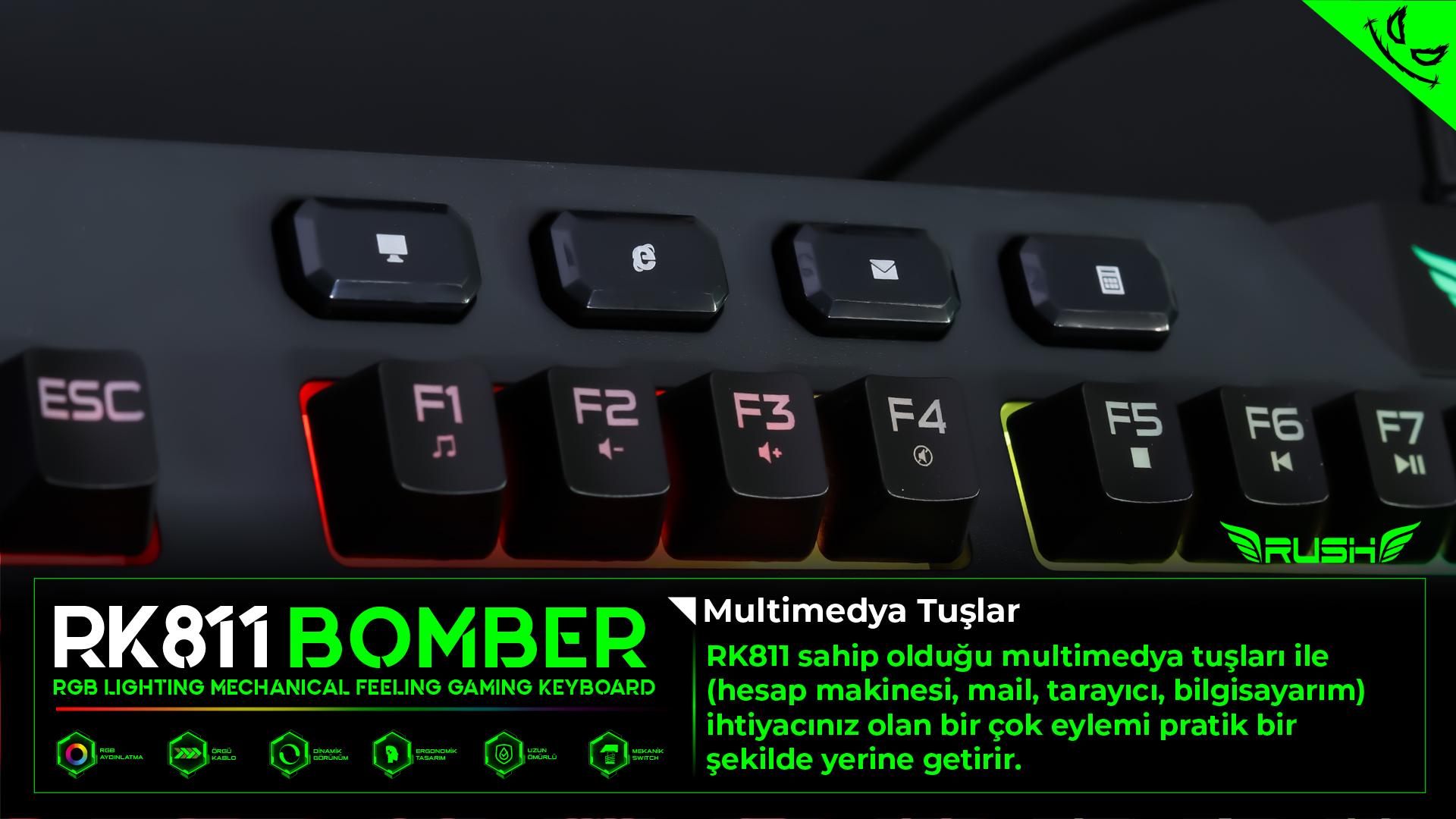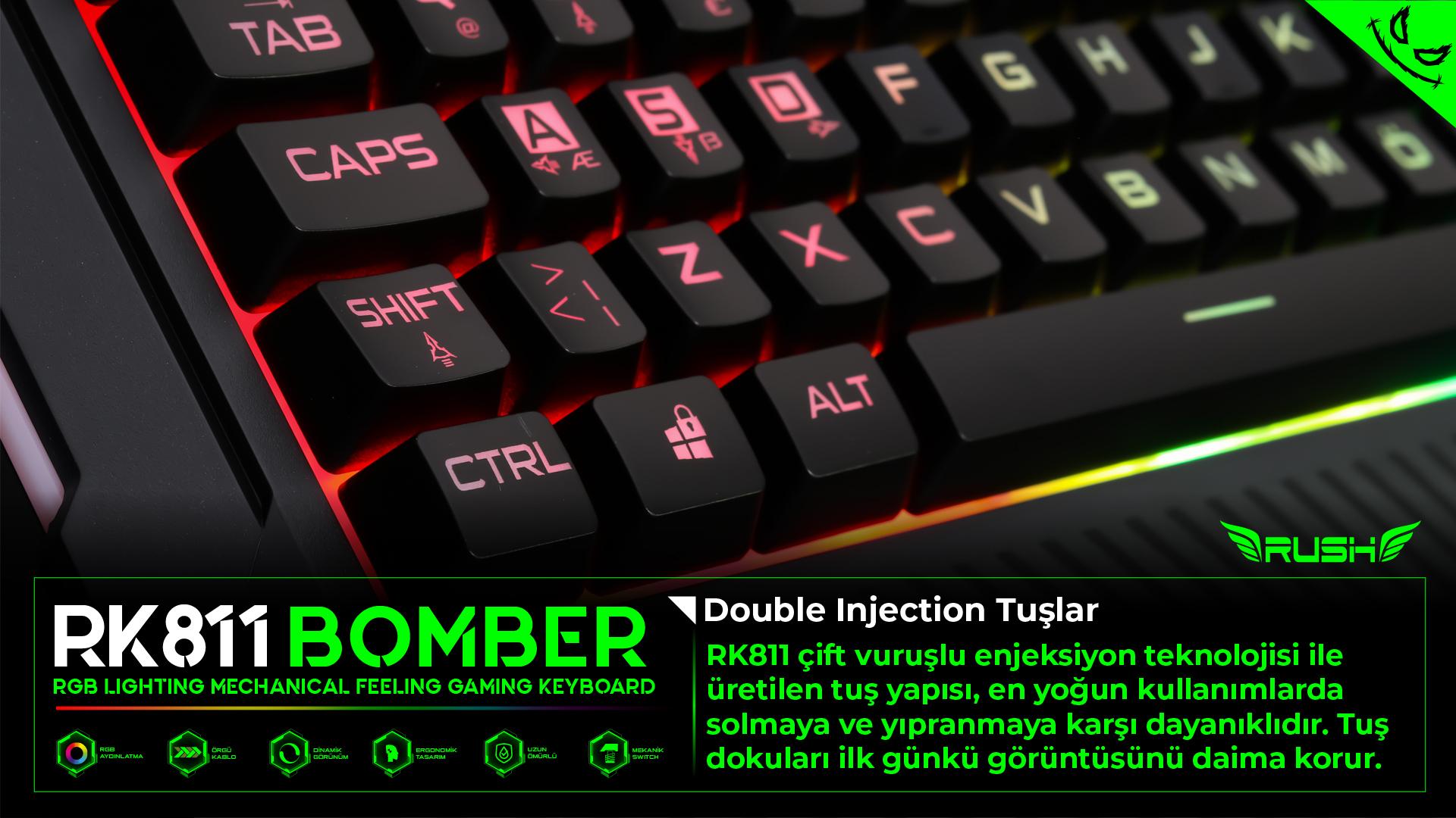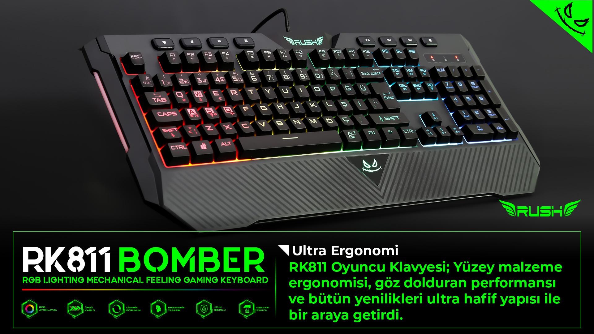 RK811 BOMBER Oyuncu Klavyesi; Güçlü ve uzun ömürlü LED teknolojisi ile RGB aydınlatma teknolojisini mekanik hisli swithcler ile birleştiriyor.