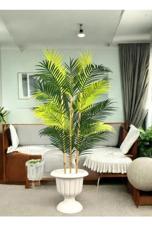 100 cm 3 gövdeli Areka Palmiyesi resimde gözüktüğü gibidir iç ve dış alanda kullanımı uygundur ürün saksiya montajlidir .