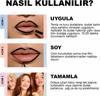 1. Adım – Uygula: Temiz ve kuru dudaklara, dudak balmı veya parlatıcı olmadan uygulayın. Aplikatör ile dudak hattınızı çizin veya tüm dudağa uygulayın. 10-20 dakika kurumasını bekleyin.