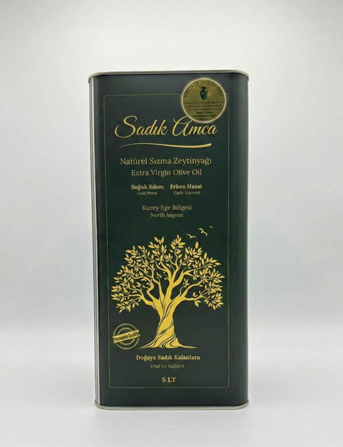 Sadık Amca 5 LT Natürel Sızma Zeytinyağı, Kuzey Ege’nin erken hasat zeytinlerinden, soğuk sıkım yöntemiyle elde edilen yüksek fenollü, dengeli ve temiz içeriğe sahip bir premium yağdır.