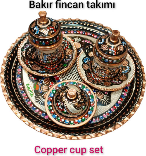 Safir Çay Kazanları Bakır Kahve Fincan Takımı Bakır Kahvelik 2 Kişilik Bakır Kahve Fincan Takımı Siyah Hicivli Model