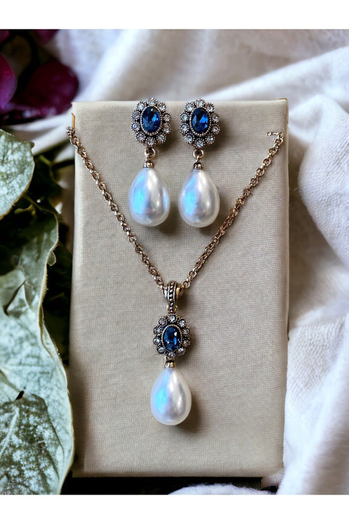 - Zarif tasarımıyla dikkat çeken oval kristal taşlı kolye ve küpe seti, her türlü özel gününüzde şıklığınızı tamamlar.; - Zirkon taş kullanımı sayesinde ışıltınızı her ortamda ön plana çıkarırken, Mayorka incisi detaylarıyla göz alıcı bir görünüm sunar.; - İki parçadan oluşan set içeriği ile hem kolye hem de küpe olarak tam bir uyum sağlar ve kombinlerinizde bütünlük yaratır.; - Türkiye\'de üretilen bu ürün, yerli işçilik ve kaliteyi temsil ederken, özgün tasarımıyla da beğeni toplar.