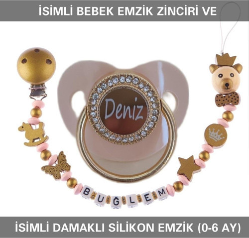 İstediğiniz isim değişikliği için; sipariş verdikten sonra sipariş numarasını (lütfen teslimat numarası değil, sipariş numarasını ) ve teslim alacak kişinin isim soy isim bilgisini ve bebeğiniz isim bilgisini satıcıya soru sor kısmından bildirmeniz yeterli olacaktır. Parlak zirkon taşlar kullanılmıştır. Metal kısımları altın renk kaplamalıdır. Babyshine marka silikon uçlu damaklı emzik (0-6 Ay) Aksesuar amaçlı kullanıma uygundur.