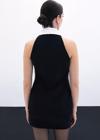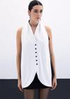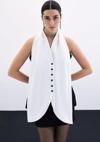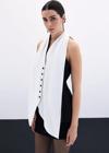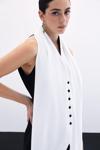 Kruvaze yaka, ön düğmeli, kolsuz, birleşik şal detaylı yelek.