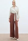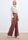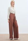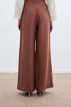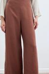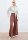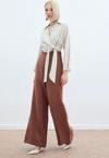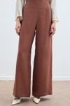 Yüksek bel, yan fermuarlı, geniş paça, salaş keten pantolon.