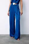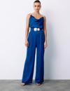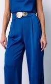 Yüksek bel, yan fermuarlı, geniş paça, birleşik kemer aksesuarlı, salaş krep saten pantolon.