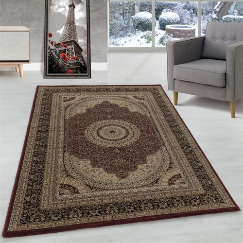 Salon Halısı Klasik Marokan tarzı Göbekli Desenli Halı Bordürlü Kırmızı Bej