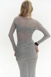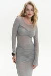 Triko kumaştan üretilmiş midi elbise. Bisiklet yaka, uzun kollu ve iç astarsız. Büzgülü detay. Ekstra ince ve yumuşak kumaş.