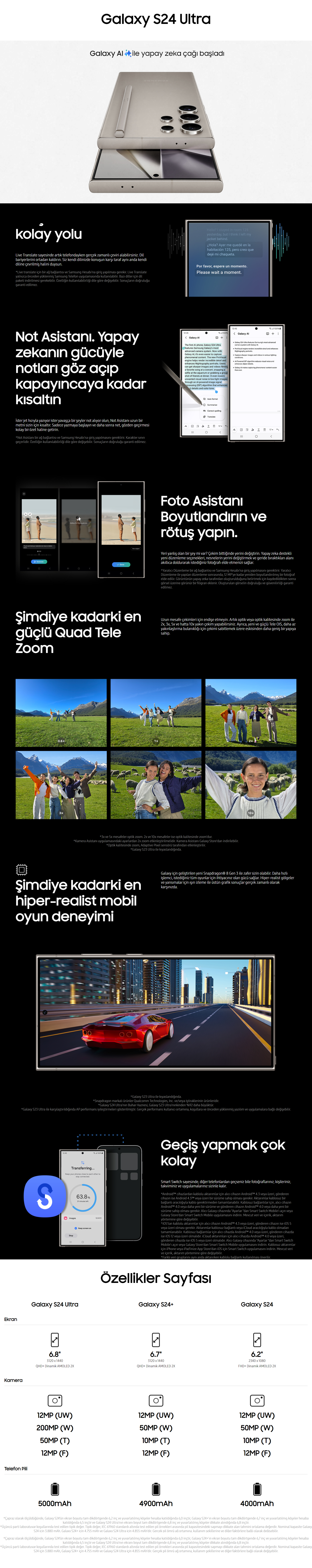 Cihazın bu özelliği, kullanıcılara geniş bir veri depolama kapasitesi sunarak fotoğraflarınızı, videolarınızı, uygulamalarınızı ve diğer verilerinizi rahatça saklamanızı sağlar. Artık depolama sorunu yaşamadan, seyahat anılarınızı, favori müziklerinizi ve daha fazlasını kolayca yanınızda taşıyabilirsiniz. Galaxy S24 Ultra, çoklu kameralarıyla fotoğrafçılık deneyimini bir üst seviyeye taşıyor. Yüksek çözünürlüklü ana kamera, geniş açılı lens, telefoto lens ve makro lens gibi çeşitli seçeneklerle, her türlü çekimde mükemmel sonuçlar elde etmenizi sağlar.