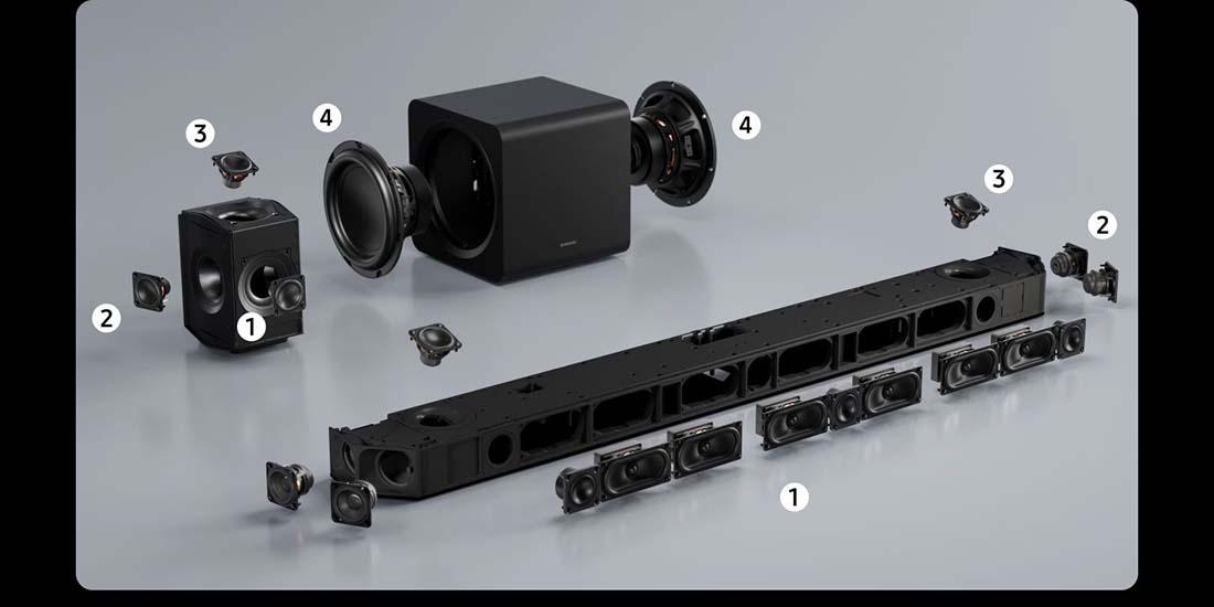 En üst seviyede sürükleyici ses için tasarlanmış bu Soundbar’ın çerçevesinde stratejik şekilde yerleştirilmiş üç tür hoparlör vardır: ön hoparlör, yan hoparlör ve üst hoparlör. Sisteme 8 inç üniteli ayrı bir derin baslı hoparlör ve bir adet arka hoparlör dahildir.