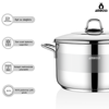 - MATERYAL: 18/10 CR-Ni paslanmaz çelik gövdesi ve keskin olmayan tencere ağzı çarpma, düşme vb durumlarda eğilme yapmaz. Isınmayan tutma sapları ve kapak sapı ile ısı kaynaklı yaralanmalara yol açmaz.