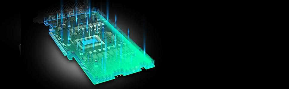 GPU, çalışma sırasında PCB'nin yüksek stabilitesini sağlamaya yardımcı olan GPU ve belleğin hızlı hızı, yüksek akım ve artan güç gereksinimini karşılamak için yüksek yoğunluklu 12 katmanlı 2 oz Bakır ve yüksek TG PCB üzerine monte edilmiştir.