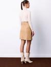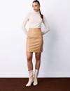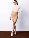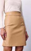 Yüksek bel, arka fermuarlı, şardonlu kısa deri etek.