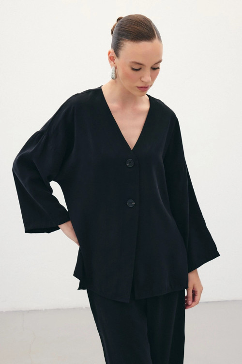 Sateen Düğmeli Kimono - Siyah