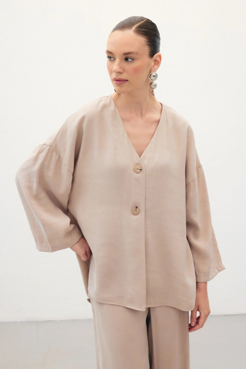 Sateen Düğmeli Kimono - Taş