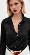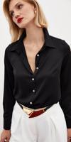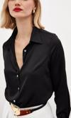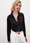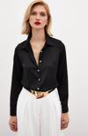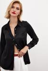Ön düğme ilikli kapama, uzun manşetli kol, oversize saten gömlek.