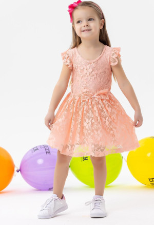 Kız Çocuk Elbise Fiyonklu Tüllü Güpürlü 3-8 Yaş, Somon