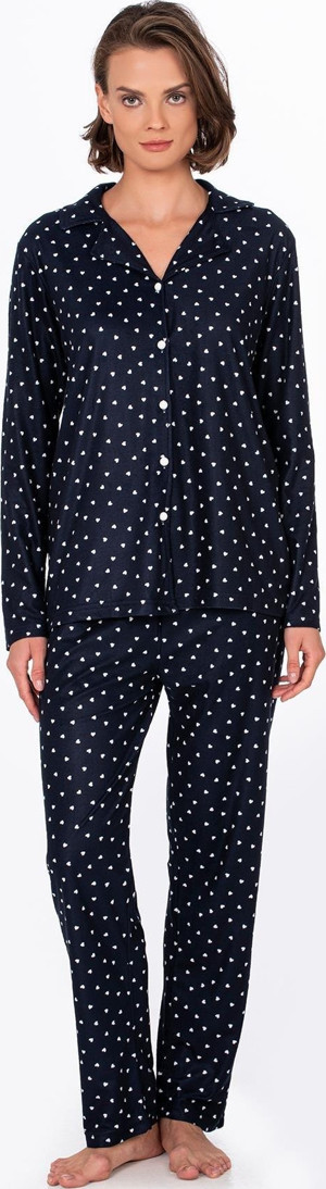 Kadın Süet Önden Düğmeli Pijama Takımı | Kalpli Lacivert