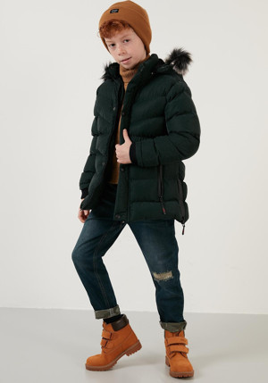 Peluş Astarlı Yakası Suni Kürklü Çıkarılabilir Kapüşonlu Kışlık Erkek Çocuk Mont 5761906 HAKİ