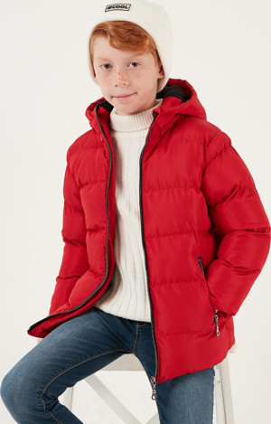 Fermuarlı Cepli Kapüşonlu Şişme Erkek Çocuk Mont 6492324 KIRMIZI