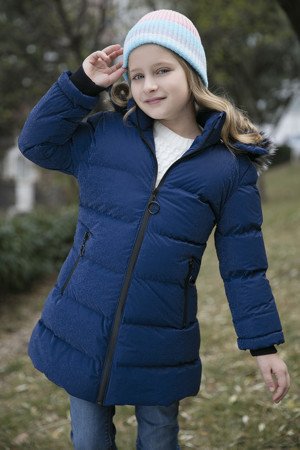Yakası Suni Kürklü Peluş Astarlı Kapüşonlu Kışlık Şişme Kız Çocuk Mont 6035018 LACİVERT